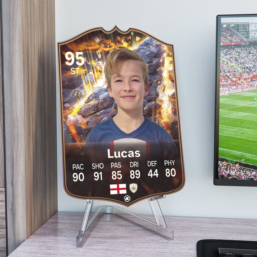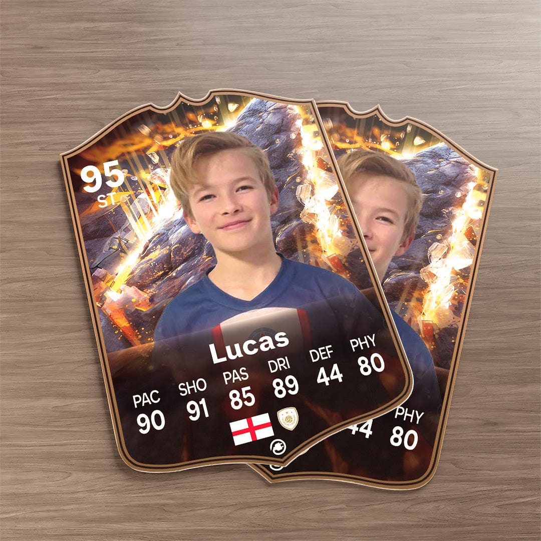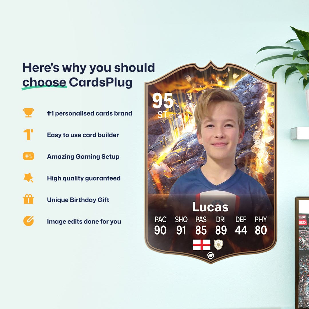 CardsPlug is home to the world’s favourite personalised football cards. Our easy football card builder lets you make a real life football card with your own name, photo, and skill ratings. With 100+ designs to choose from and some inspired by EA SPORTS FC 26 cards seen in EA FC 26, EA FC 25 and FC 24 as well as FIFA cards seen in games like FIFA 23 and FIFA 22.
