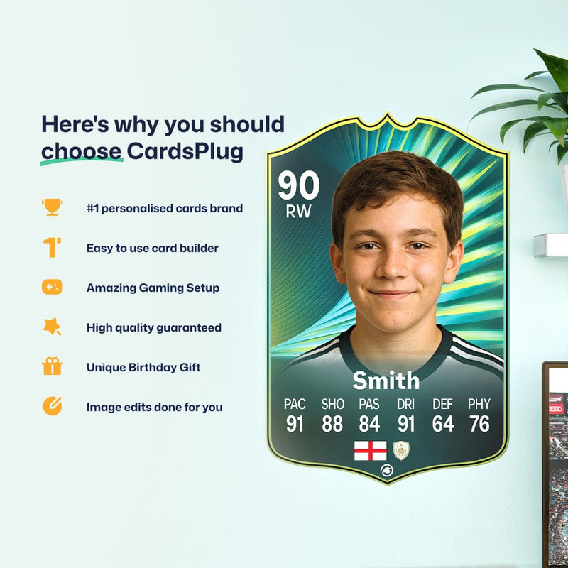 CardsPlug is home to the world’s favourite personalised football cards. Our easy football card builder lets you make a real life football card with your own name, photo, and skill ratings. With 100+ designs to choose from and some inspired by EA SPORTS FC 26 cards seen in EA FC 26, EA FC 25 and FC 24 as well as FIFA cards seen in games like FIFA 23 and FIFA 22.