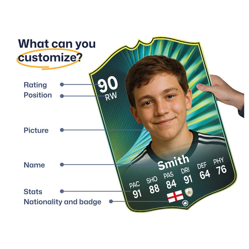 When it comes to personalising your card, the basic steps are to upload a photo and add a name to your card. Then you’ll add details like your player’s position and skill ratings out of 99 for each football skill shown on the card. Our online card builder makes this really easy. And if you aren’t a football card expert, don’t worry!